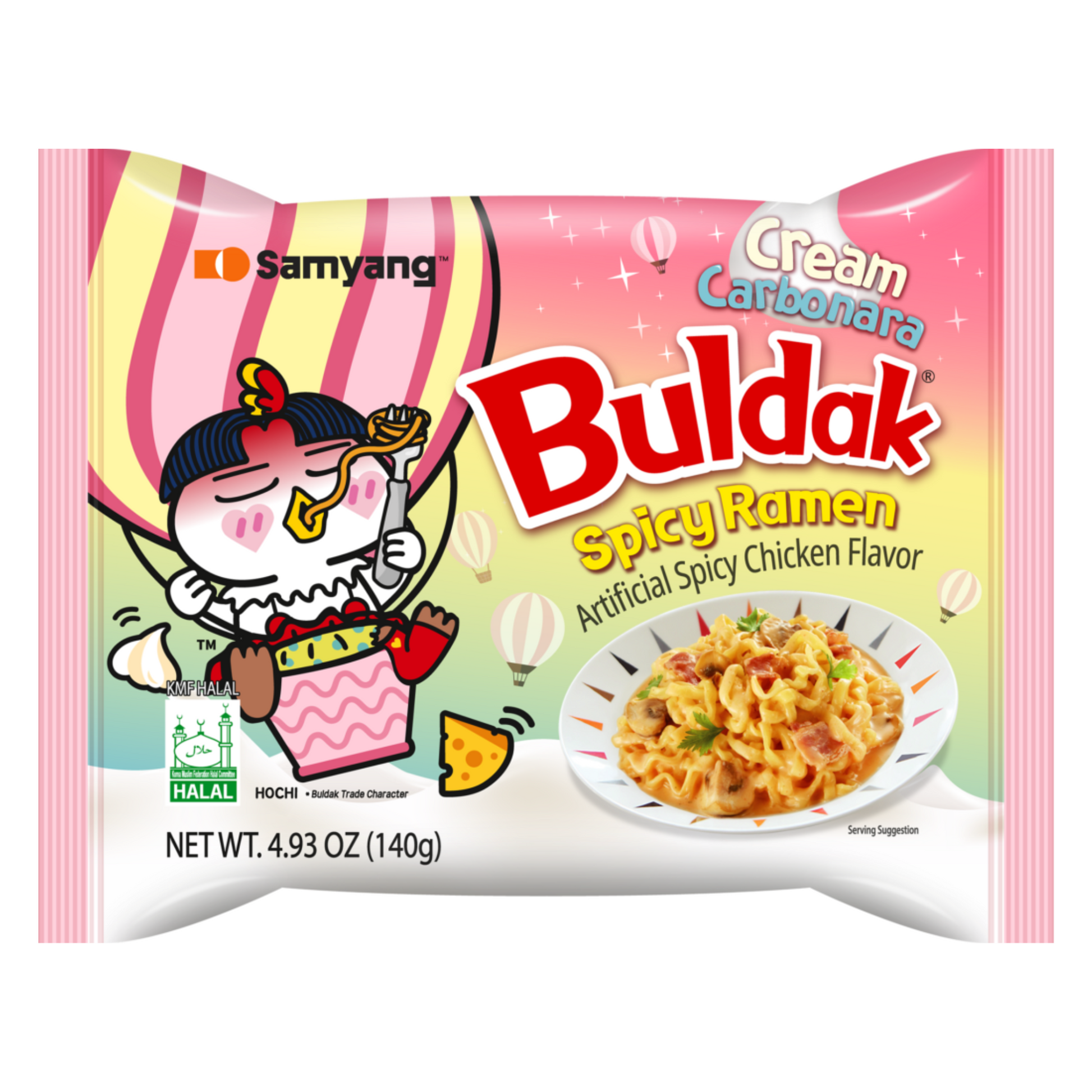 - A box includes 7 x 140g individual packets of Samyang Cream Carbonara Buldak Hot Chicken Ramen